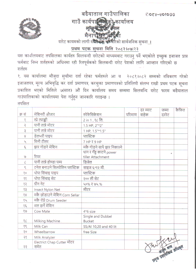 कृषिजन्य बिषाधिको दररेट कायमका लागि दररेट पेश गर्ने सम्बन्धि सूचना