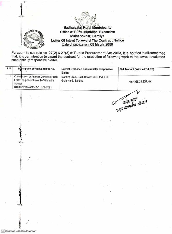 बोलपत्र स्वीकृत गर्ने आशयको सुचना।