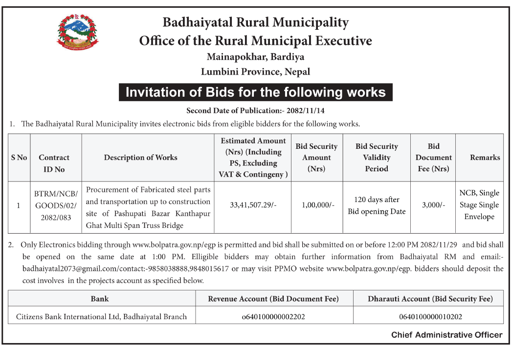 invitation of Bids for the following works