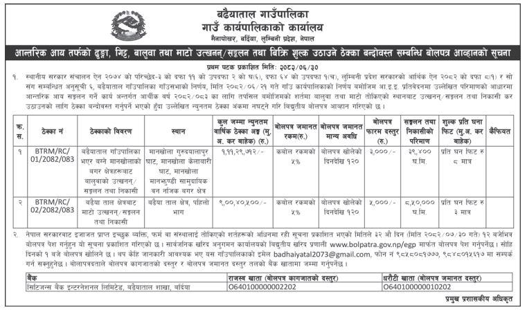 आन्तरिक आय तर्फको ढुङ्गा गिट्टी वालुवा तथा माटाे उत्खनन् /सङ्कलन तथा विक्रि शुल्क उठाउने ठेक्का वन्दाेवस्त सम्बन्धि बाेलपत्र आह्वानको सूचना