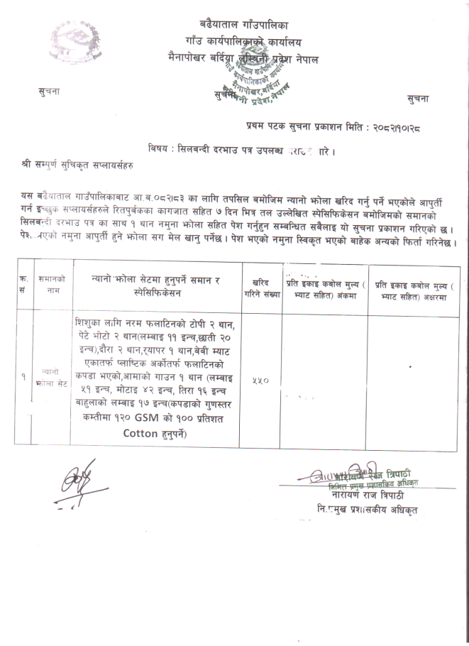सेनिटरि प्याड खरिदका लागि बाेलपत्र आह्वान सम्बन्धि सुचना