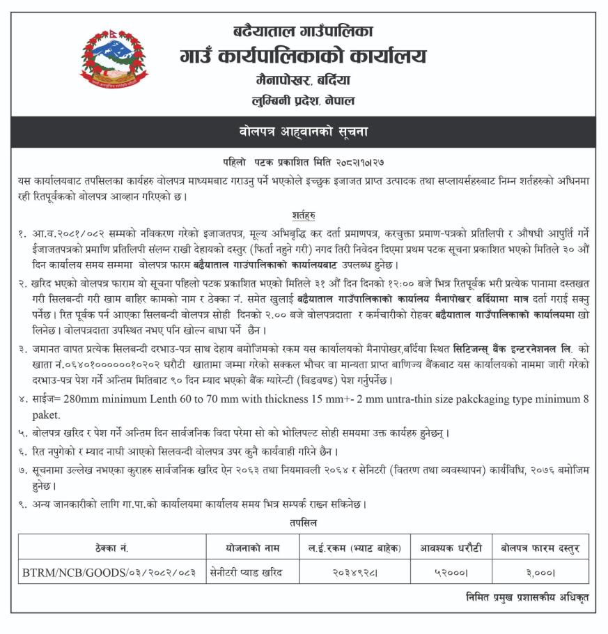 » सेनिटरि प्याड खरिदका लागि बाेलपत्र आह्वान सम्बन्धि सुचना